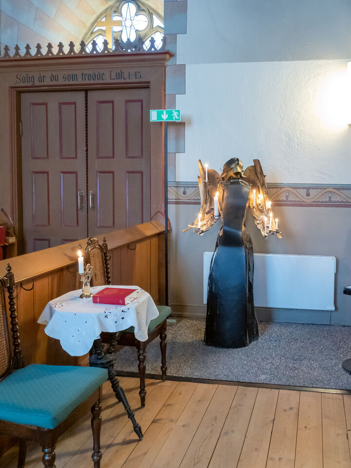 Ängeln är skapad av konstnären Bo Åke Adamsson. Bo Åke Adamsson bor bredvid kyrkan och är välkänd i konstkretsar och bland ... läs mer..